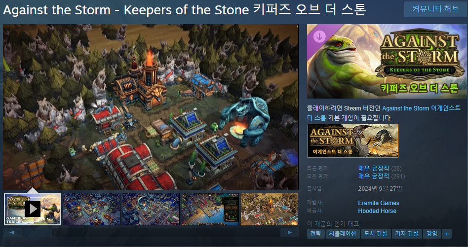 파멸폭풍에 맞서 살아남기 위한 투쟁이 계속되는 가운데, Against the Storm - Keepers of the Stone 에서 새로운 종족, 두 개의 새로운 생물군계와 더불어 도전에 나서는 총독을 위한 엄선된 신규 건물, 지령, 위험, 기회를 선보입니다. 폭풍을 막으려는 노력에 돌쌓기 기술과 물에 대한 애정을 가진 개구리가 합류합니다. 한편, 흐름의 변화가 멀리서 새로운 가능성을 열었습니다. 폭우 아래서 셀 수 없이 많은 주기를 보낸 끝에 드디어 해안 숲에 들어갈 수 있게 되었습니다. 외딴곳에 있고 접근하기도 어렵지만 이 지역의 고대 수중 정착지에는 발견되기를 기다리고 있는 엄청난 보물이 있습니다. 한때 번성했던 숲이 산업화의 물결로 인해 황폐해진 지금, 특별한 기회가 모습을 드러냅니다. 잿빛 덤불에는 부러진 나무와 옛 시대의 잔재가 널브러져 있으며 이곳의 잃어버린 영광을 되찾아줄 유능한 총독을 기다리고 있습니다.