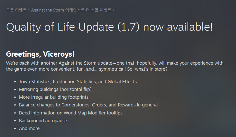 Eremite Games는 새로운 콘텐츠 제작에 한창이지만, 그 사이에 커뮤니티의 의견을 반영한 편의성 개선 및 밸런스 조정 업데이트를 출시했다.