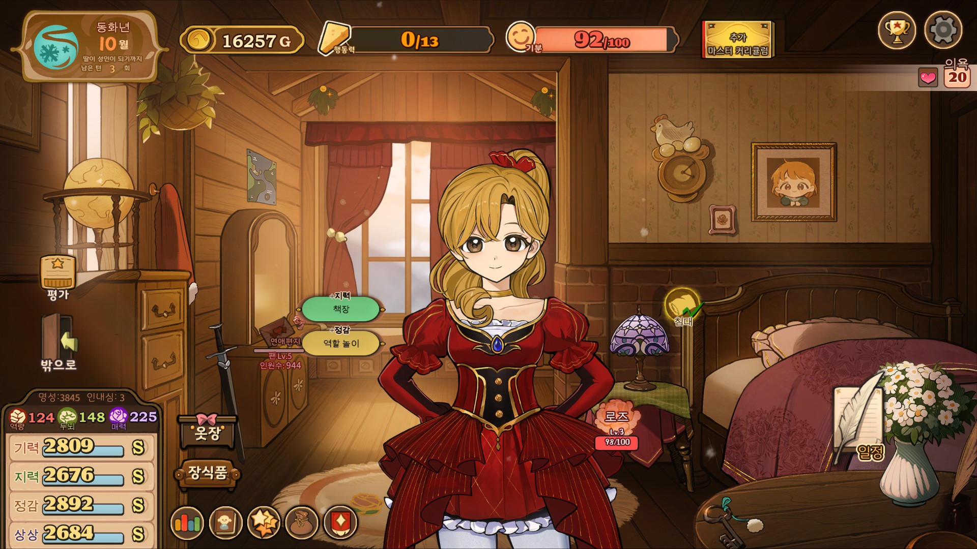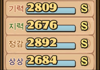 기분: 기본 100점 기준이다. 수업 일정을 할 때마다 10점 씩 소모되며, 기분이 50 이하가 되면 기초 속성이 절반이 된다.
