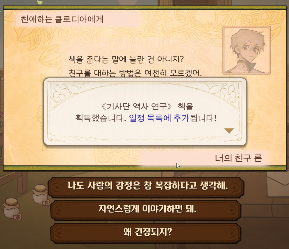 NPC들과 호감도를 올려 지인, 친구, 단짝이 될 때마다 편지로 책을 받을 수 있다. 교육 일정이나 지도를 통해서 이수가능하며, 보통 요구하는 기초 속성이 낮은 편이라 보통 1회 이수율이 100%다.