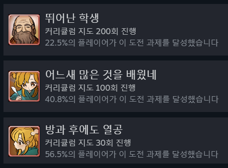 도전과제로 각 반별 커리큘럼 이수 및 최대 100개 커리큘럼 이수 달성이 있다.
