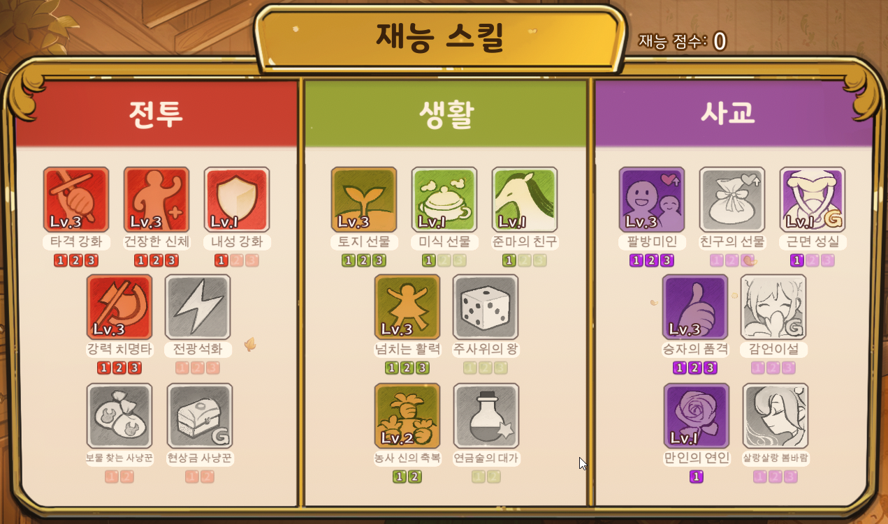 전투, 생활, 사교 스킬로 나뉘며 각 분야별로 육성하는데 여러 도움이 된다. 기초 속성의 등급이 오를 때 마다(예.기력 C->B) 재능 스킬 포인트가 1점 씩 생긴다. 한번 선택한 스킬포인트는 취소할 수 없으니 신중해야한다.