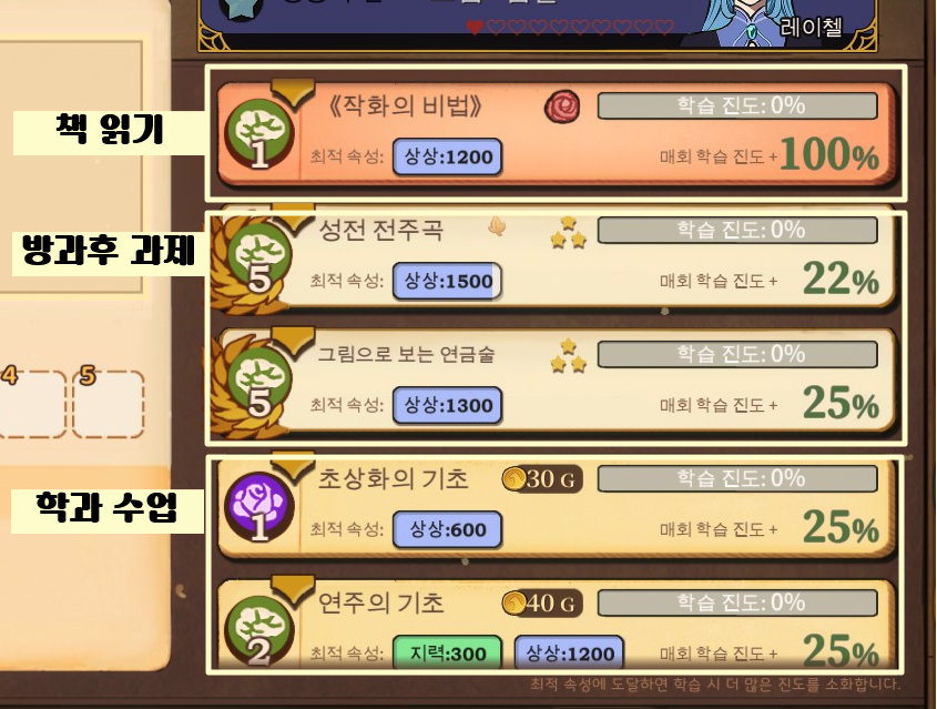 수업을 100%이수하면 해당 학과 점수를 12점 얻을 수 있다. 보유하고 있는 기초속성에 따라 1회수업에 최대 25% 이수율을 가져간다. 반대로 속성이 낮으면 이수율이 10%도 안 될때도 있으니 가능한 기초속성이 높은 수업부터 듣는 게 좋다.