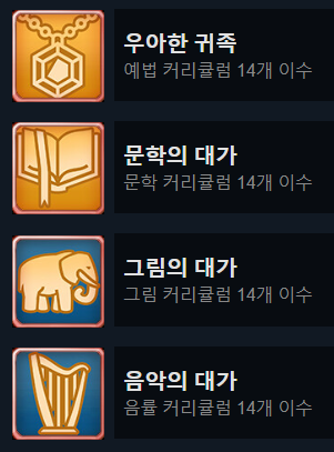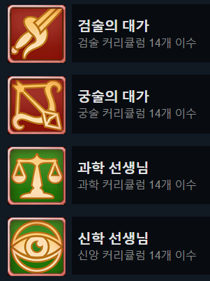 역량 | 커리큘럼 이수, 연금술, 음식, 극장, 서적, 의상 등등 | 사냥, 던전 및 어둠의 골목 탐방 등 | 군주, 기력 계열 |