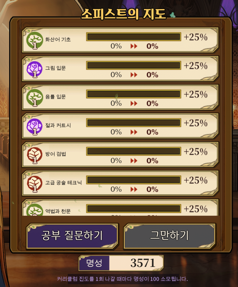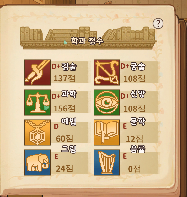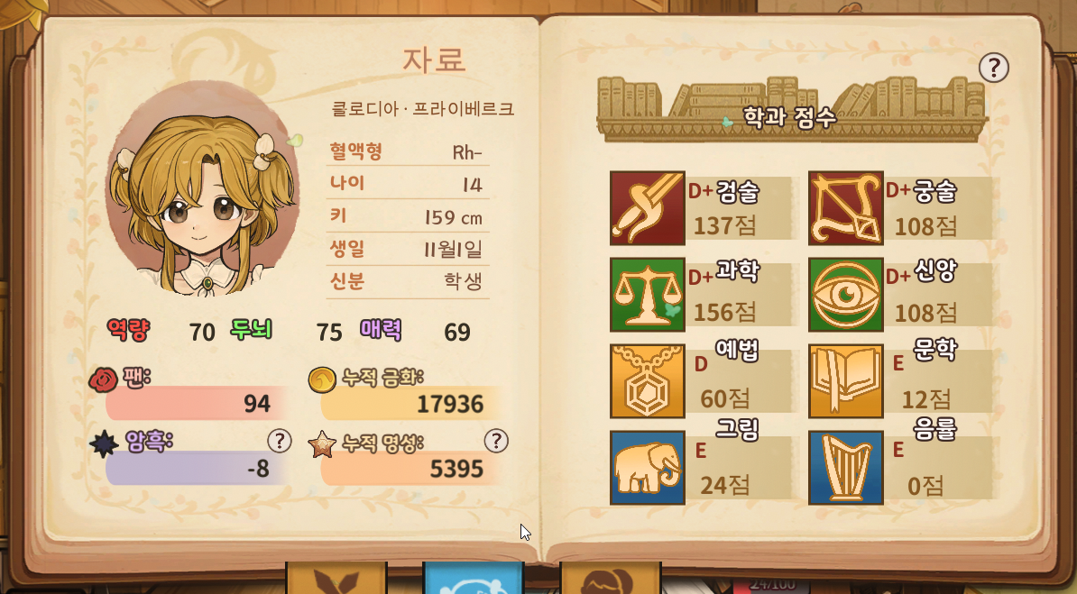 - 수업 이수할때마다 기분이 3씩 감소하며, 암흑이 50이상이면 지도를 수행할 수 없다.